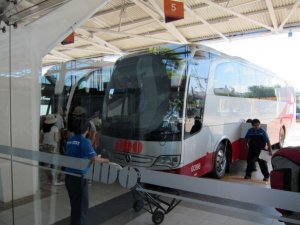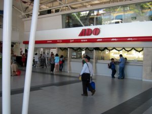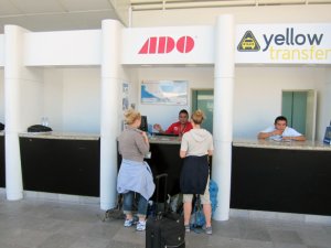 Once clearing customs, about 50 different taxi drivers are going to ask you if you need a ride. Politely refuse, and continue walking through the terminal. It is not necessary to change your US money into pesos unless you are planning on staying in Mexico for awhile. The ADO bus ticket counter will take your US dollars and give you change in Pesos. The counter is located to the right of the international terminal about 75 yards, just ask one of the many people trying to sell you a taxi ride… where is the ADO bus is if you get confused. Everyone speaks english at the airport.